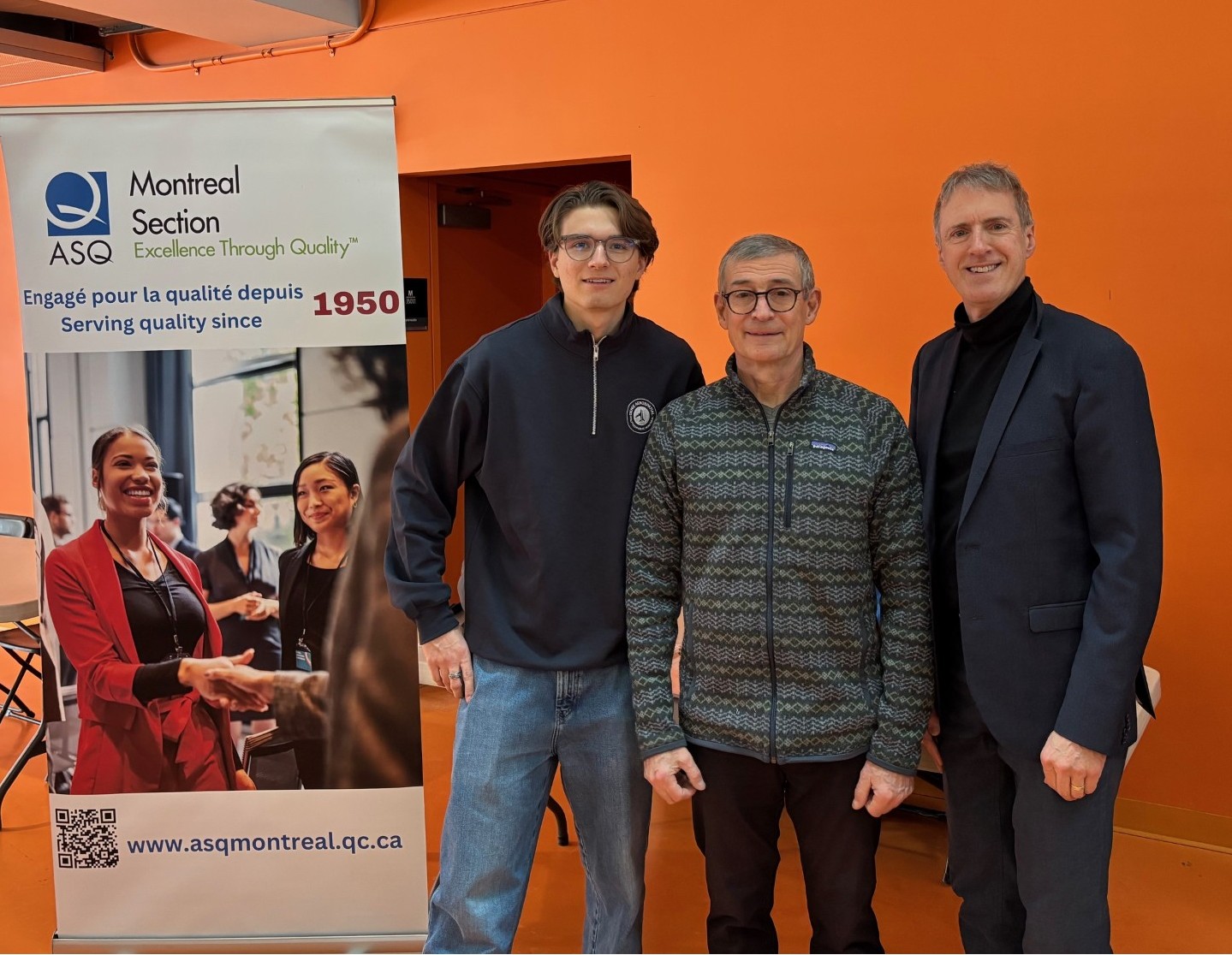 At the invitation of the CEGA (Aerospace Engineering Student Committee), Eric HOSKING and Pierre MARQUIS represented ASQ Montreal during the career day, displaying banners and information sheets about the certifications offered by ASQ. The event was organized by the Poly student association, mechanical and aerospace engineering concentrations. In the photo, the committee chair, Olivier GUY-SAMSON, is pictured with us.