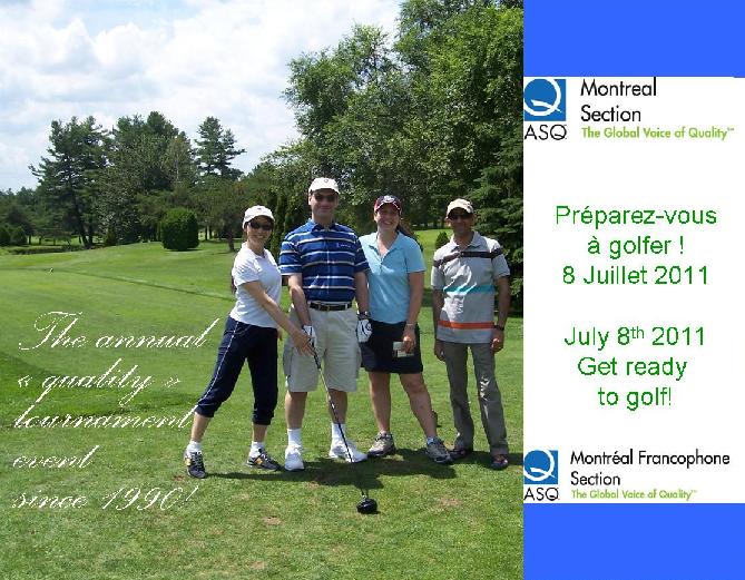 We had a great season in 2010-2011, and we will begin this new year on a great note with the Quality Golf Tournament on July 8. Please, join us for this great event that rings together quality professionals from the Greater Montreal Area. I want to congratulate all 2011-2012 elected executives form both 401 and 404 Sections in Montreal. Our Section Executive will be mostly feminine in 2010-211 with Hong Ping (Holly) Zhao as Secretary, Mitchell Daudier as Treasurer and myself as Chair. We will be counting on William (Bill) Wilson as Vice-Chair. We are supported by a very dynamic group of 18 volunteers. If you want to help us in anyway, please contact me or any other Leadership team members. You can easily find us at our monthly events and at the Golf Tournament next month. |