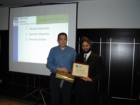 ASQ Awards / General Assembly (April 2012) On April 18, 2012 during our General Assembly meeting, we recognized three of our leadership team members and one company for their commitment and outstanding contributions for enhancing Quality goals and objectives of our section and the community. Khaled Khattab, ASQ Senior Member and Awards Chair announced three awards to Peter Amsden, Stephen Jones and Sukhvinder Jutla. These members have demonstrated true leadership qualities and commitment. Please join us in thanking them for their involvement. Pratt & Whitney Canada received a special award due to its continuous support and dedication to our section and our leadership team, where four of its employees serve as members. Left