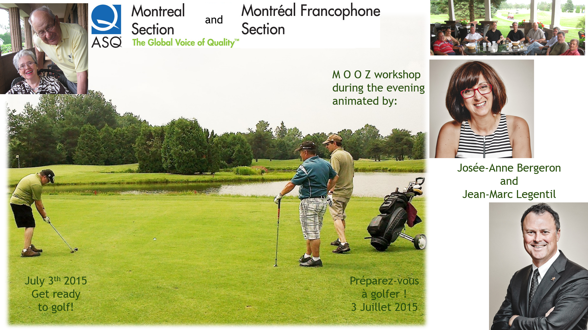 Chantale Simard, ASQ Senior Member, CMQ/OE, Section Secretary![]() This year, it is the 26th edition of the ASQ 401-404 Golf Tournament. You should not miss it! This will take place at the Base-de-Roc golf course in Joliette, Friday, July 3, 2015. Once again, there will be special entertainment during the evening. This time, a workshop will be animated by Jean-Marc Legentil, Management Consulting Consultant and Contractor, Bell Nordic Conseil and Josée-Anne Bergeron, Directrice Conseil, Bell Nordic. The subject will focus on the M O O Z. It is an experiential activity to help teams evolve towards a goal. Riddles to solve, sharing opinions, and reflecting on our attitudes and behaviors when solving problems will be explored. Fun guaranteed! Invite one of your friends to participate in this annual event. The cost is $100, including golf and dinner, or $50 for dinner only. Complete the registration form. For sponsorships, contact persons are listed on this form. An enjoyable time for everyone and a lot of participants! Ovide, Denise, Marie-Ange and I are looking forward to welcoming you! 4. The Editor's Corner