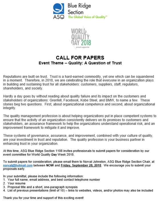 New ASQ (season and direction) We are returning for a new season of ASQ and lots of things have changed. First, we are regenerating our Leadership Team (LT), adding new member/leaders to make your season different than the previous one(s) and generating new ideas (with younger actors). Second, the upper management of ASQ (USA) is renewing/revamping the formula to better manage the funds, do an integrated web approach and be closer to the sections. We must remember that we are as good as we are today! Yesterday does not count and changes are the base of Continual Improvement (CI), something at the heart of Quality (5th principle). It cannot remain empty talk; it’s got to start at the base, with management. I say base for management because that is what management is all about: the base, the foundation of a good organization. The pyramid must be inverted, management should always be those that support the operations and initiate changes according to what they hear on the floor. I know, human nature looks for stability and what I am proposing here is change, thus instability. Is it instability or is it that we fear of losing, the power acquired with time? CI requires motivation, and motivation comes from within. Motivation is lack of demotivation, and CI is the battle we have to fight everyday against laziness. Personal story: My son has two (2) College degrees (I did not accept less than one – and paid for them) and after trying to find a job in Cinema (first degree), he soon found out that this was not the ideal for money making. If I had initially looked like Brad something and I had married some Angelina star, it may have been different. So my own angel (read here my wife) found another degree he could study in with respect to his own style and what he liked (stardom). After another 2 years of full time school he got his second College degree in Web Design. Today he is making more money than me and makes me proud, but I still fear for him. He has stopped learning. I think I said it previously, but you are as good as you are today! Yesterday does not count. Recently he was managing employees and that takes him away from what he is good at: creation. So, away from what you are good at, means replacement and hard to go back. So I made him an offer: chose something that leads to a certificate and I will take the class with you. He said cooking. So what have YOU changed lately? Tell me about your own CI story (work or personal). Don’t hesitate to share your comments when we meet, we strive on originality, improvement and our fuel is your comments, good or bad! Have a great new season and help me make my final stretch (until December 2018) as Section Chair a continuing success. |